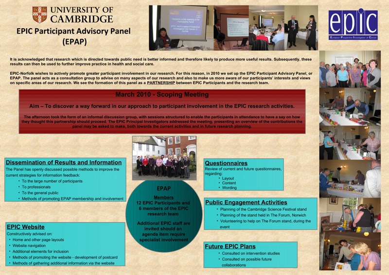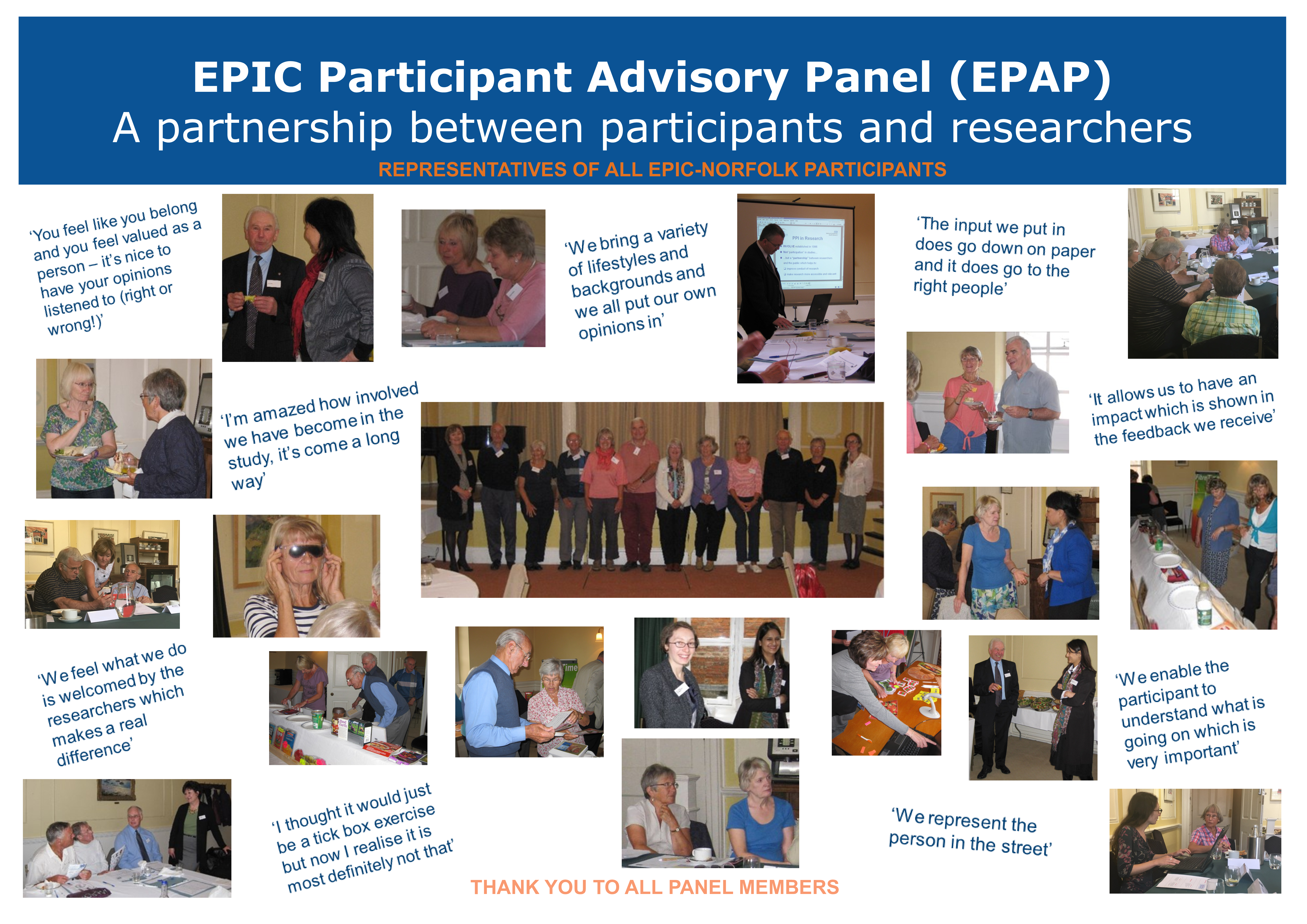 The EPIC-Norfolk study actively promotes greater participant involvement in research. In 2010, the EPIC-Norfolk Participant Advisory Panel (EPAP) was established. EPAP is a consultative forum and has provided a participant perspective on how research is prioritised, planned, conducted, communicated and used. EPAP is viewed as a partnership between EPIC-Norfolk researchers and participants.
